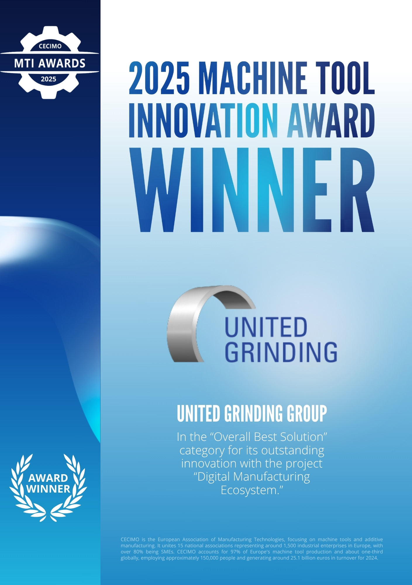 Mit grosser Freude blickt UNITED MACHINING SOLUTIONS auf einen phänomenalen Erfolg bei den diesjährigen Machine Tool Innovation (MTI) Awards 2025 zurück, welche von der Europäischen Vereinigung der Werkzeugmaschinenhersteller (CECIMO) ausgetragen wurden. Gleich zweimal konnte die Gruppe die Jury überzeugen: UNITED GRINDING wurde mit dem Hauptpreis Best Overall Solution für ihre wegweisende Gesamtlösung „Digital Manufacturing Ecosystem“ ausgezeichnet, während CHARMILLES den Green Impact Award für nachhaltige Innovation mit dem Projekt „Precision redefined with 3D Shaping & LASER S 500 U“ gewann. Beide Preise wurden im Rahmen der EMO Hannover 2025 verliehen – der weltweit führenden Fachmesse für Werkzeugmaschinen und Fertigungstechnologien. Damit feierte die neu formierte Gruppe einen doppelten Triumph und setzte ein starkes Zeichen für ihre Innovationskraft.